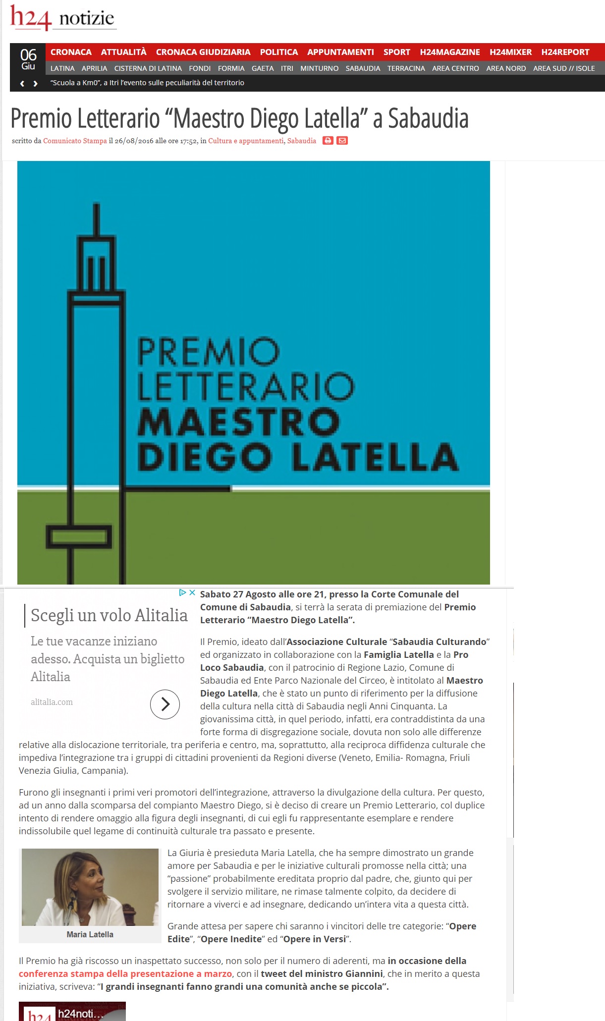 Rassegna Stampa & Web 2016 PREMIO LETTERARIO MAESTRO DIEGO LATELLA A SABAUDIA H24NOTIZIE 26 AGOSTO 2016 Immagine 3 di 5